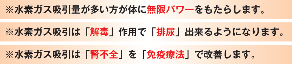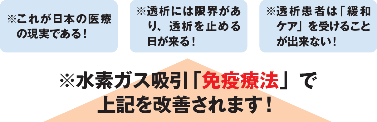 透析と同時に水素ガス吸引を行なう。自宅で時間の有る限り水素ガス吸引を行なう。